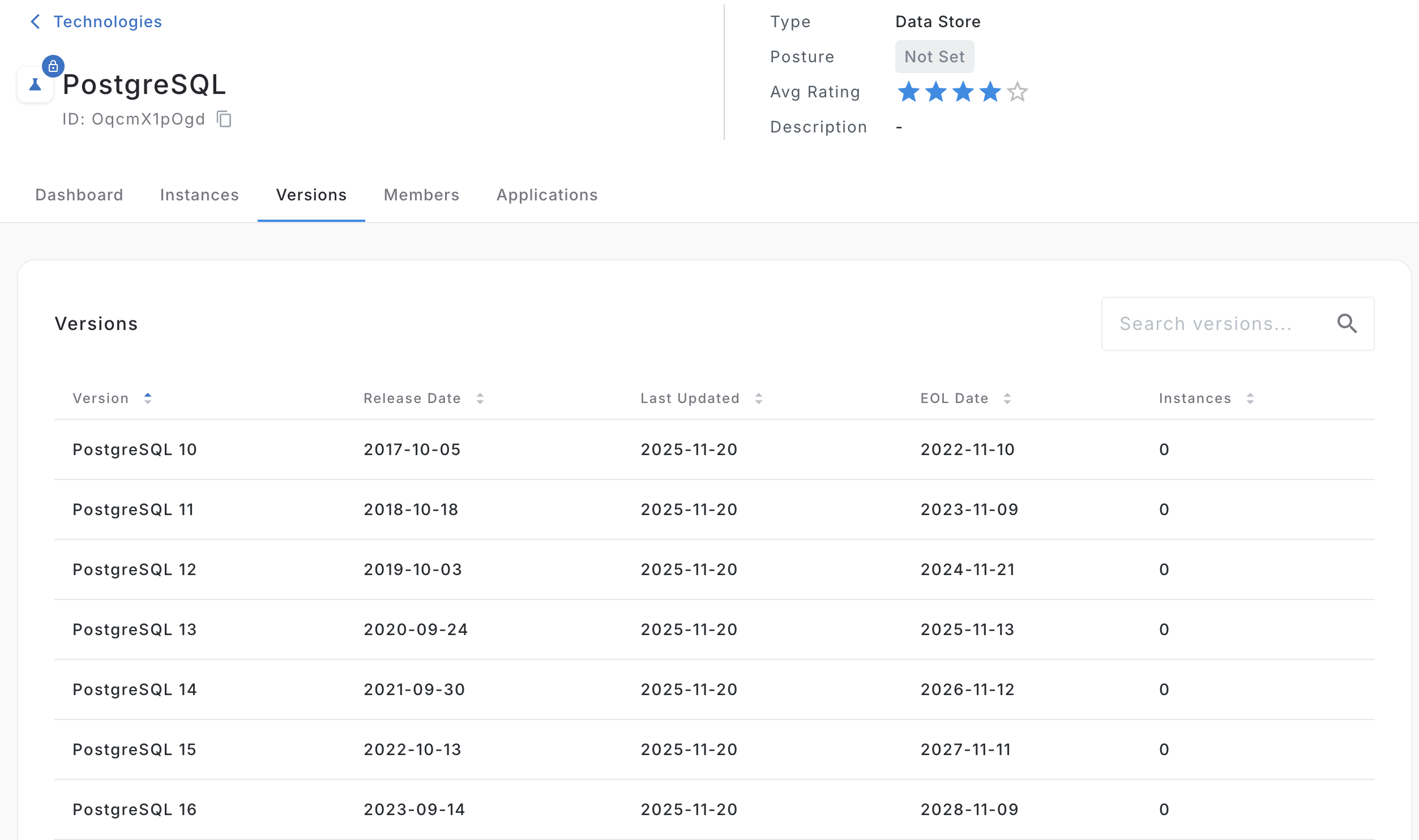 A Technology Version is the level where support and lifecycle data is tracked, including EOL date/status.